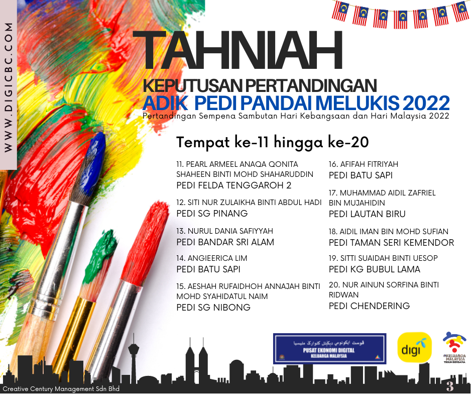Sukacita dimaklumkan bahawa berikut merupakan keputusan PERTANDINGAN ADIK PEDI PANDAI MELUKIS 2022 yang telah diadakan bersempena sambutan Hari Kebangsaan dan Hari Malaysia baru-baru ini. Sejumlah lebih 1,000 penyertaan di kalangan kanak-kanak berusia 12 tahun ke bawah telah diterima dari seluruh Negara. Pemilihan telah dibuat berdasarkan ketepatan tema, kreativiti dan kekemasan seni yang dihasilkan. Keputusan para juri adalah muktamad.