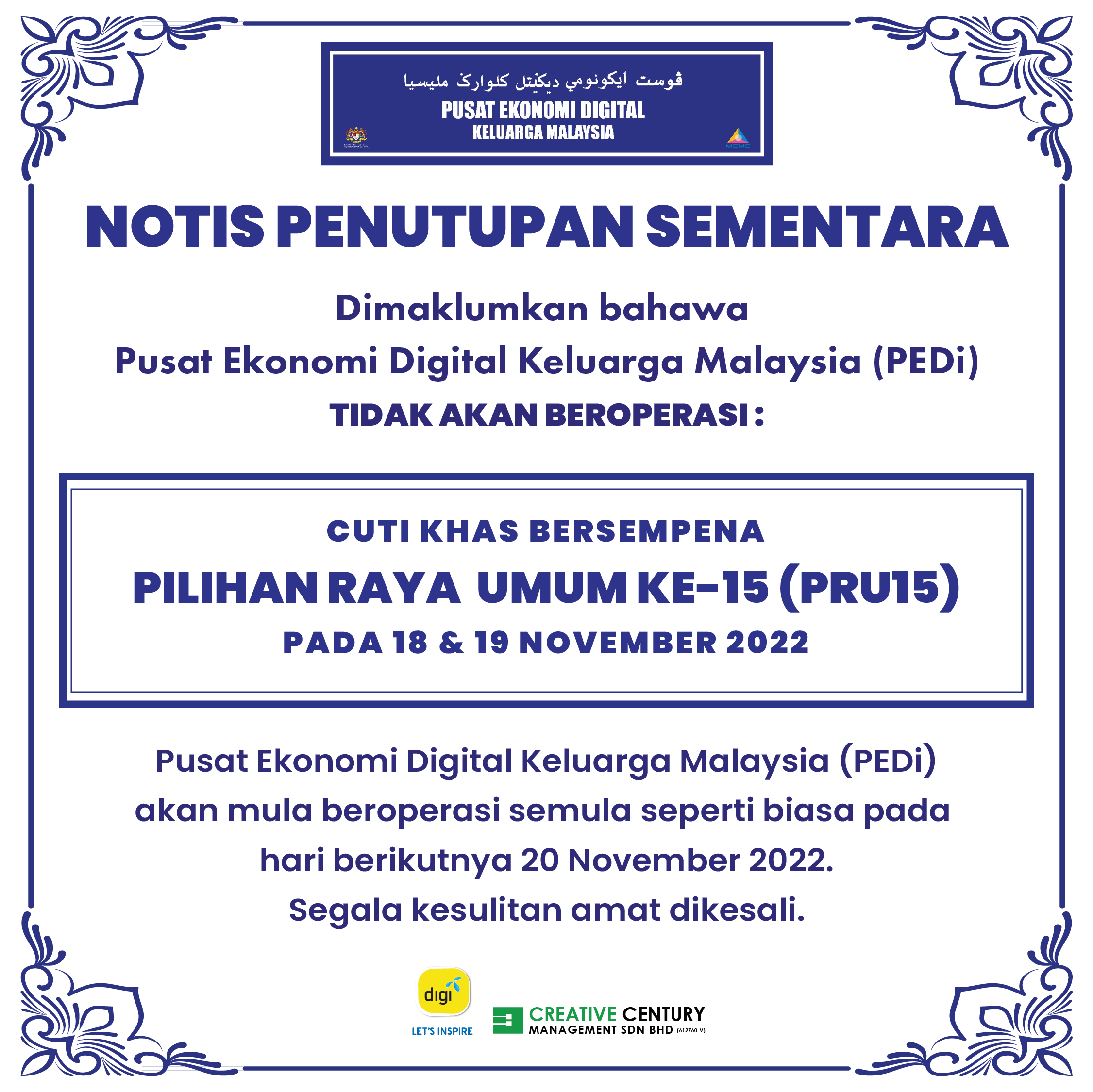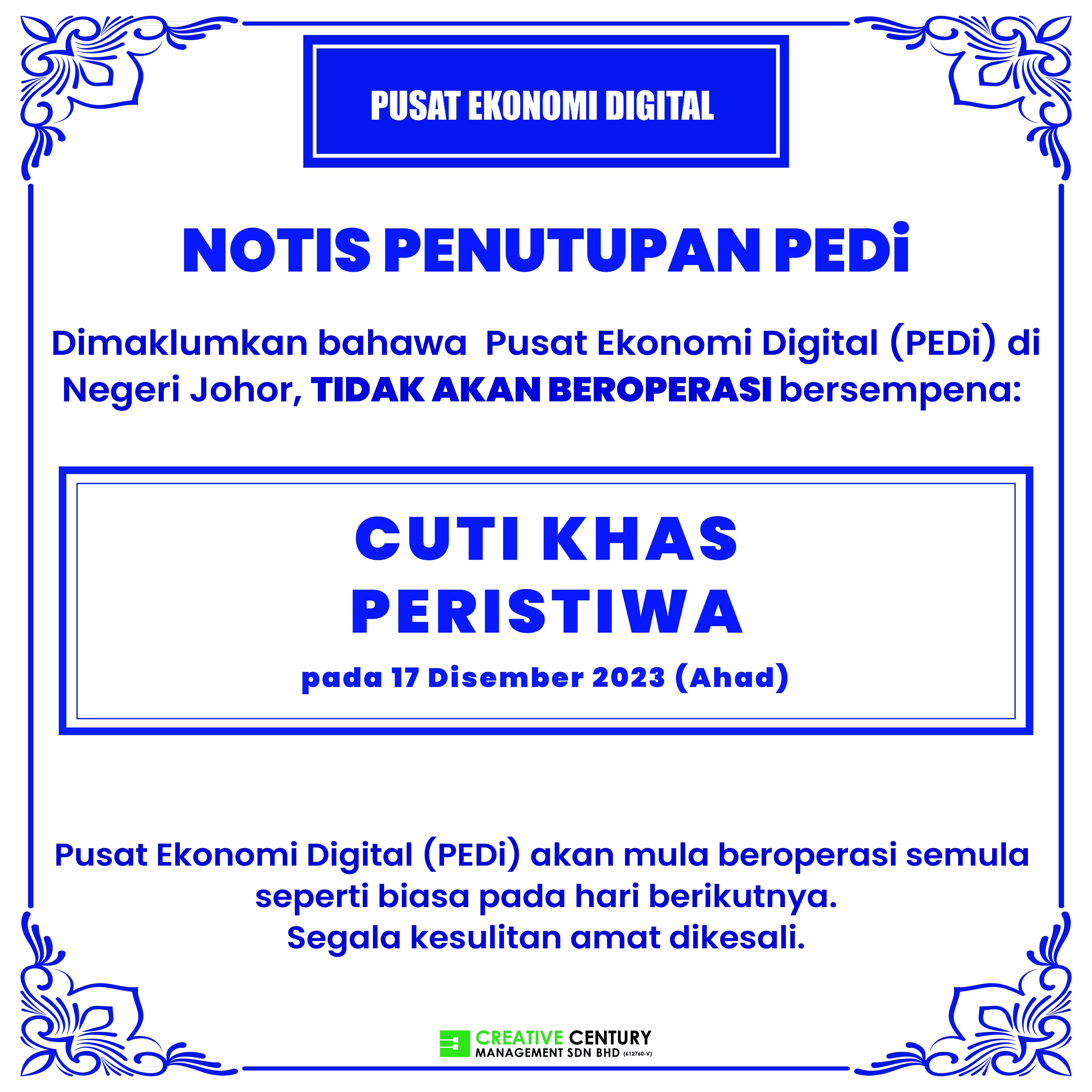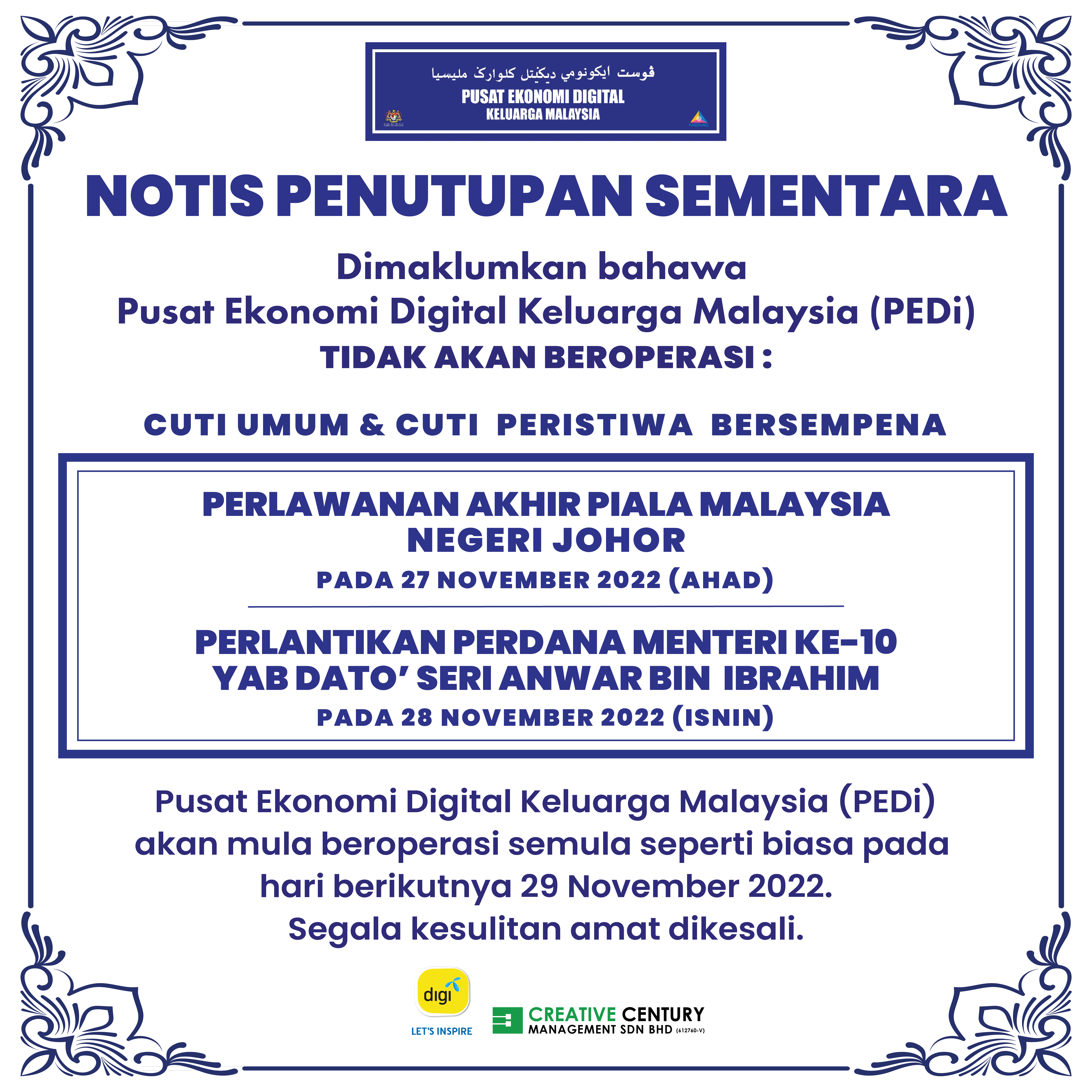Dimaklumkan bahawa Pusat Ekonomi Digital Keluarga Malaysia (PEDi) bagi negeri Johor akan di tutup sementara bersempena Cuti Pertistiwa susulan kejayaan pasukan Johor Darul Takzim melangkah ke perlawanan akhir Piala Malaysia dan Cuti Umum Pelantikan Perdana Menteri ke-10 pada 27 dan 28 November 2022 (Ahad & Isnin).