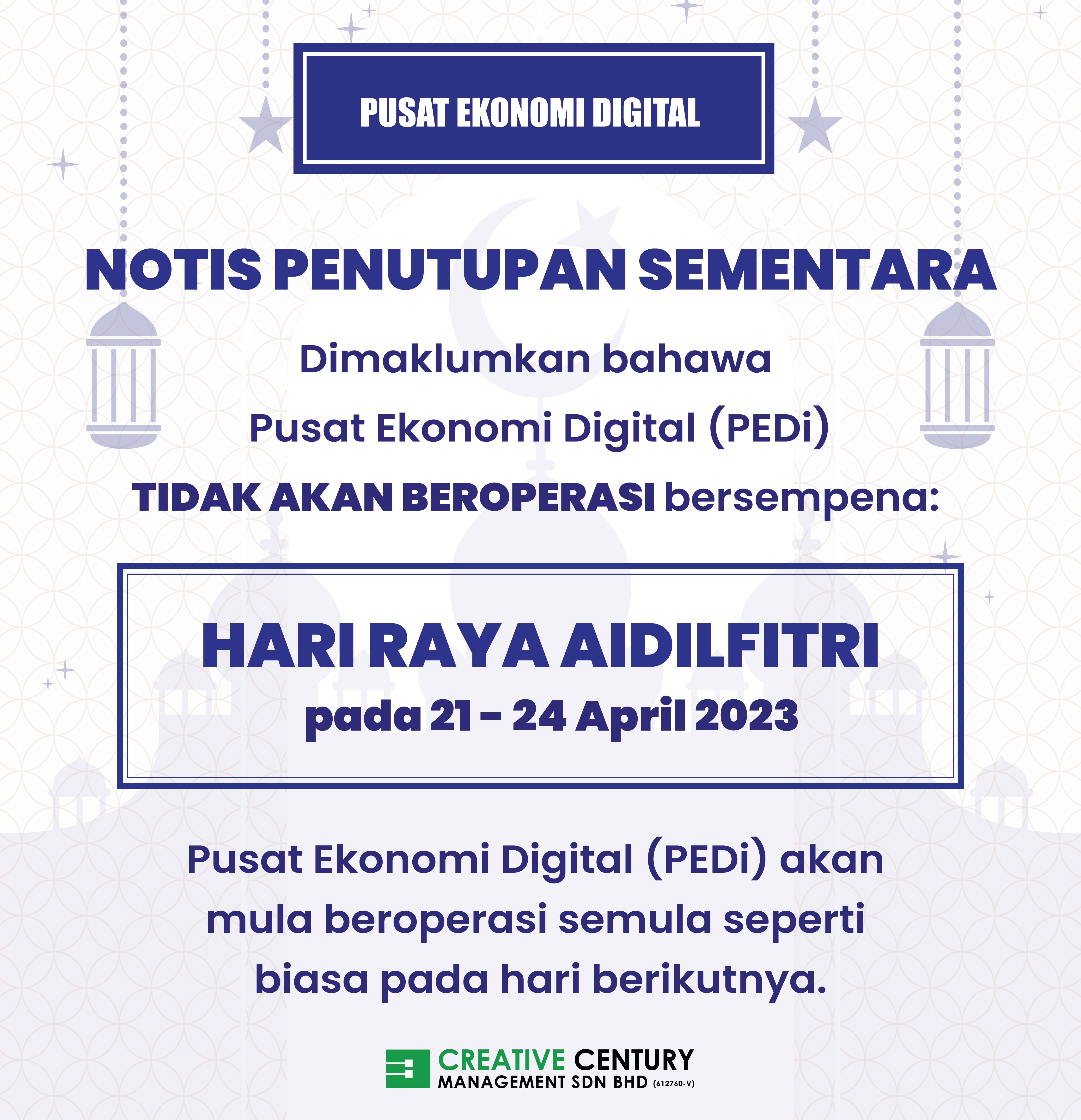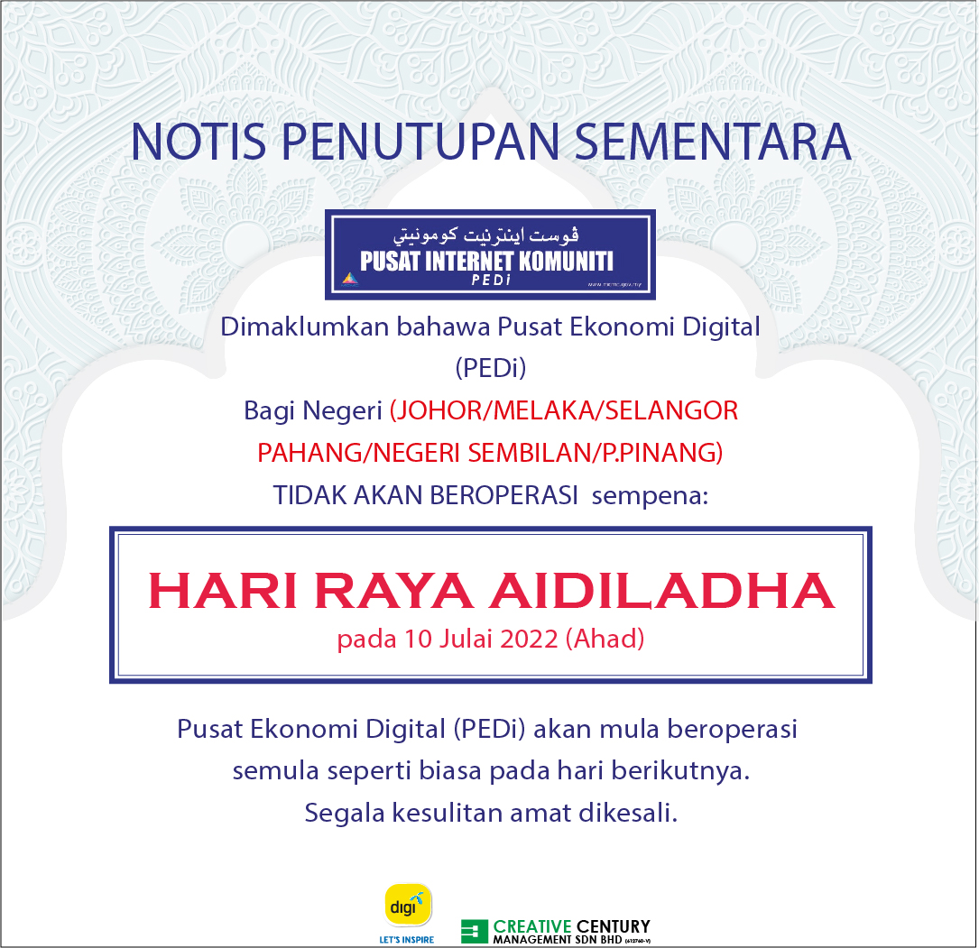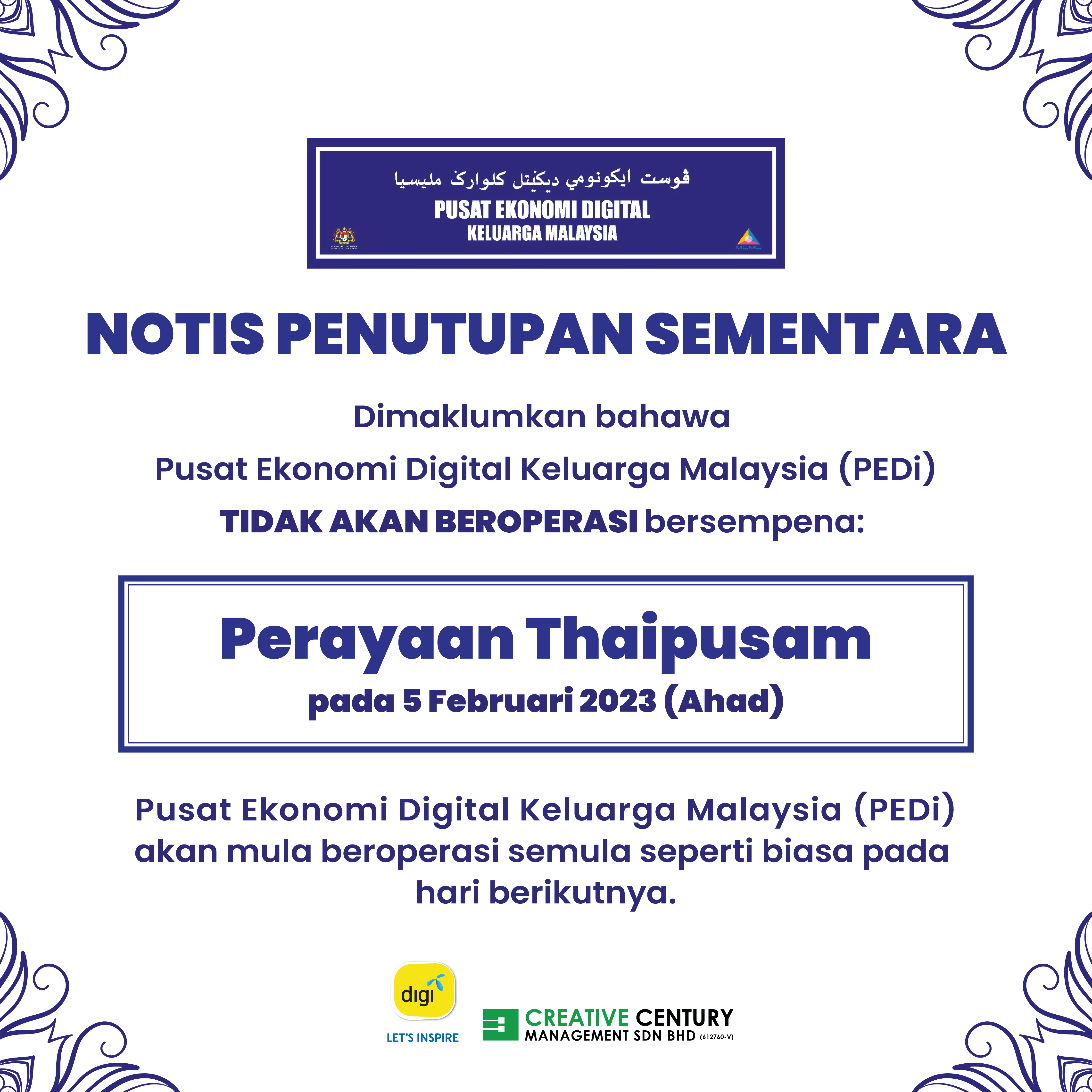 Dimaklumkan bahawa Pusat Ekonomi Digital Keluarga Malaysia (PEDi) bagi negeri Johor akan di tutup sementara bersempena Cuti Pertistiwa susulan kejayaan pasukan Johor Darul Takzim melangkah ke perlawanan akhir Piala Malaysia dan Cuti Umum Pelantikan Perdana Menteri ke-10 pada 27 dan 28 November 2022 (Ahad & Isnin).