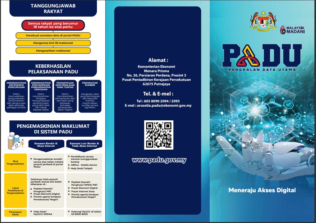 Pangkalan Data Utama (PADU) mengandungi profil individu dan isi rumah meliputi warganegara di Malaysia. PADU ini meningkat kecekapan sistem penyampaian perkhidmatan kerajaan.