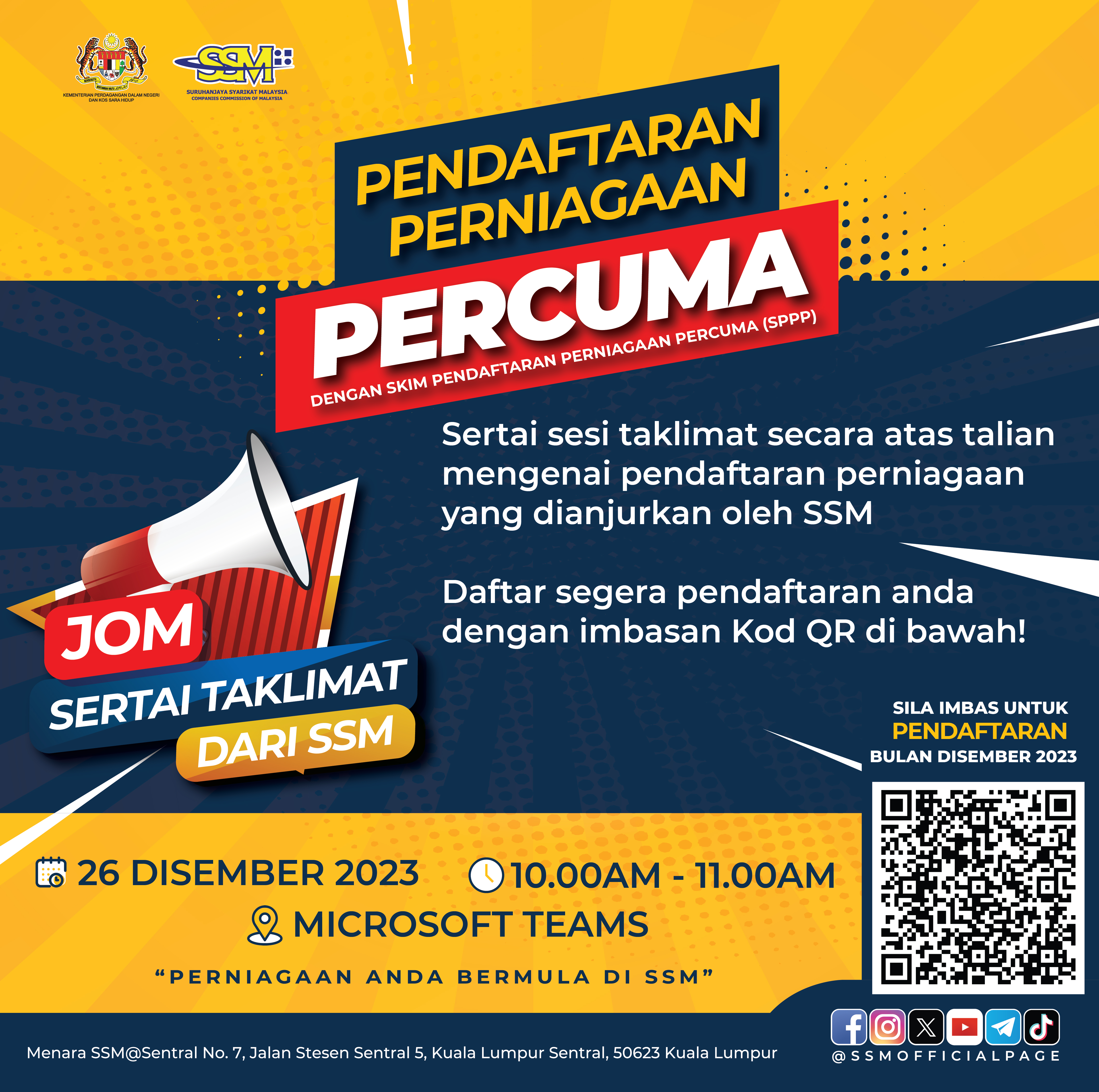 Untuk makluman, pihak Suruhanjaya Syarikat Malaysia (SSM) iaitu salah satu rakan strategik Program Pemerkasaan Pendigitalan Usahawan Kecil (PUPUK) akan menganjurkan Siri 6/2023 Webinar Pendaftaran Perniagaan kepada Usahawan Pusat Ekonomi Digital (PEDi) pada 26 Disember 2023 (Selasa).