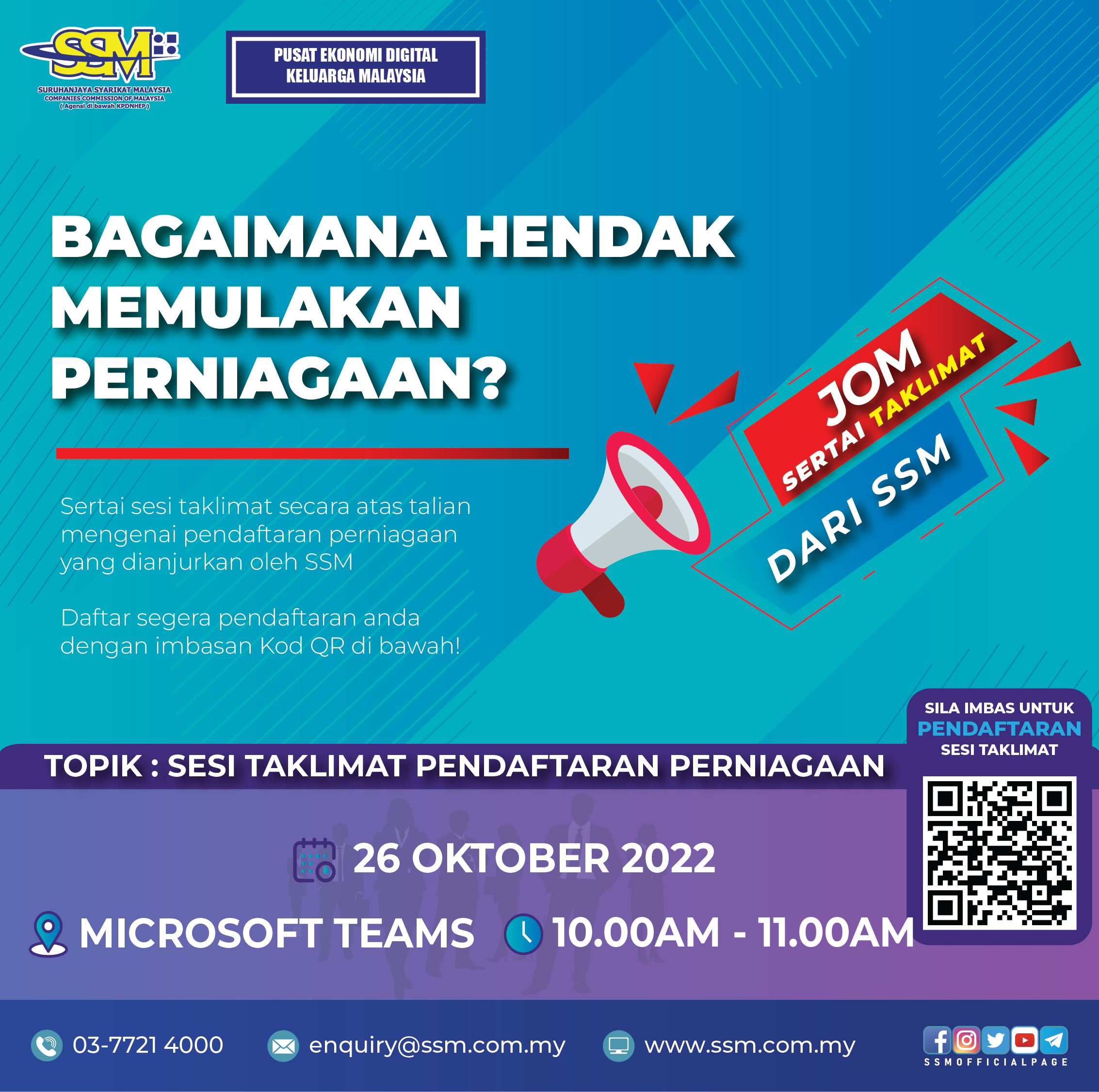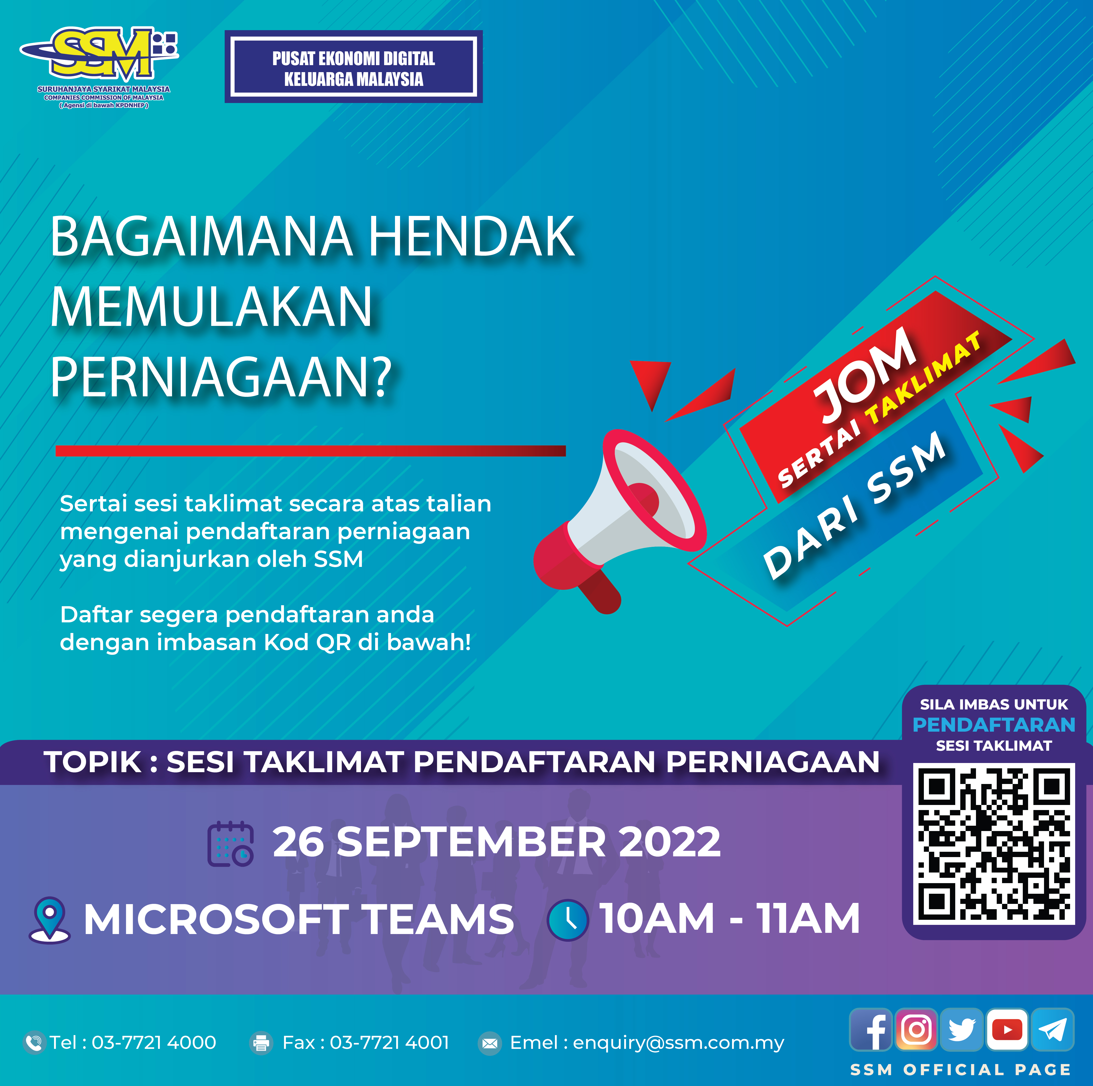 Suruhanjaya Syarikat Malaysia (SSM) akan menganjurkan sesi taklimat Pendaftaran Perniagaan Peringkat Nasional Siri 03/2022 sebagai salah satu aktiviti di bawah Program Pemerkasaan Pendigitalan Usahawan Kecil (PUPUK) setiap bulan bermula Julai 2022 dengan kerjasama bersama pihak SKMM menerusi jaringan Pusat Ekonomi Digital Keluarga Malaysia (PEDi) seluruh Negara.
